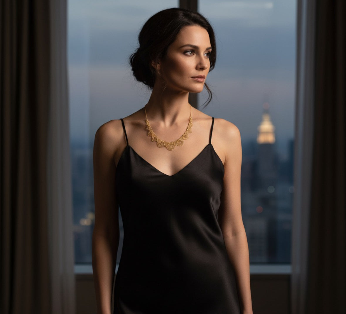 Un collier au design dentelle exclusif, réalisé en or 18K naturel avec une finition éclatante et un travail soigné sur la maille. La mode européenne revisitée dans une pièce qui exprime élégance et prestige. La touche parfaite pour sublimer une tenue de soirée et afficher un style audacieux et luxueux.