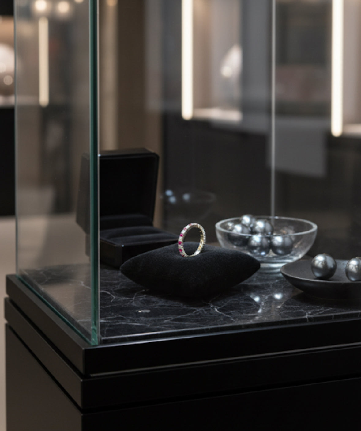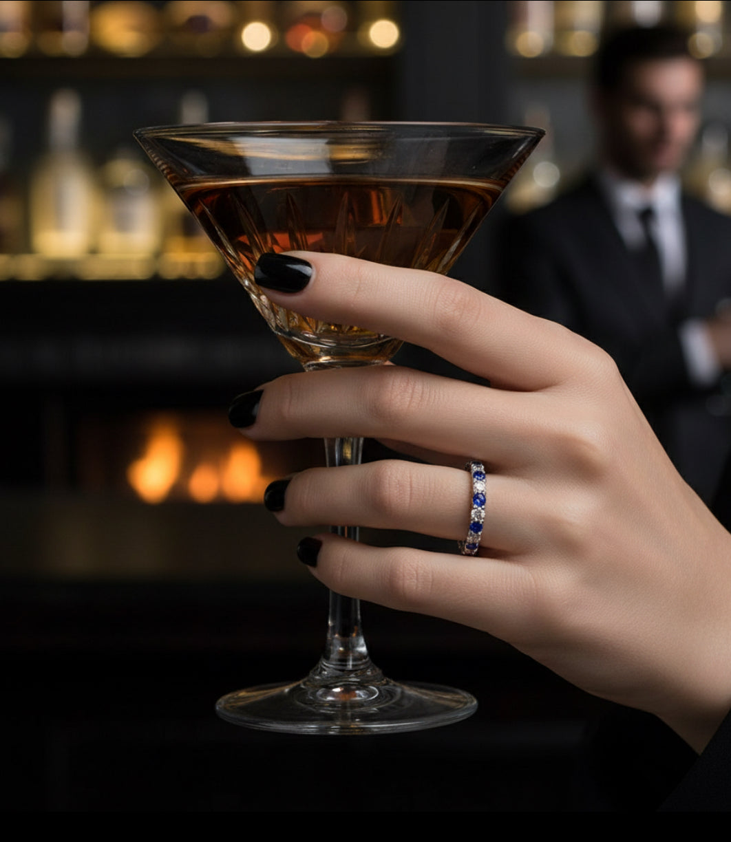 A refined row of brilliant stones with a red-sapphire look, set on platinum-plated silver. Slim, bright and stackable—perfect for a dressy night or a polished daytime finish.